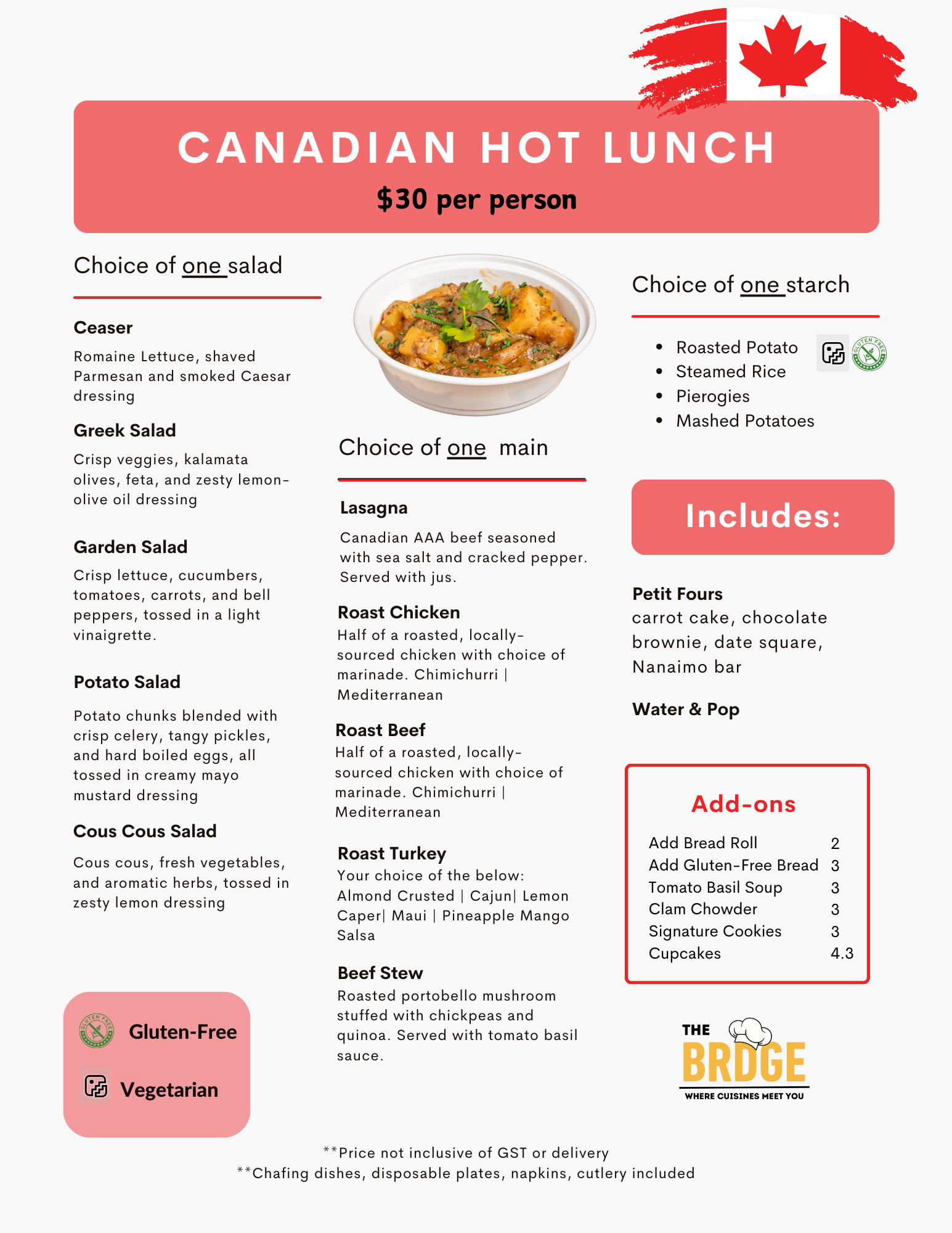 Enjoy a classic Canadian feast with premium proteins, hearty starches, fresh salads, and seasonal vegetables, perfectly curated for a warm and satisfying meal.