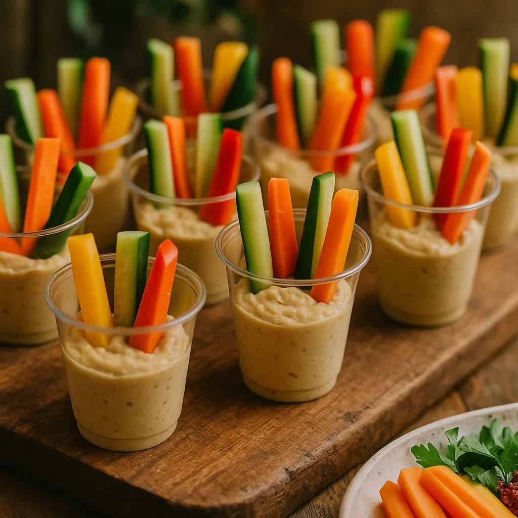 Mini cups filled with hummus and sliced veggies.